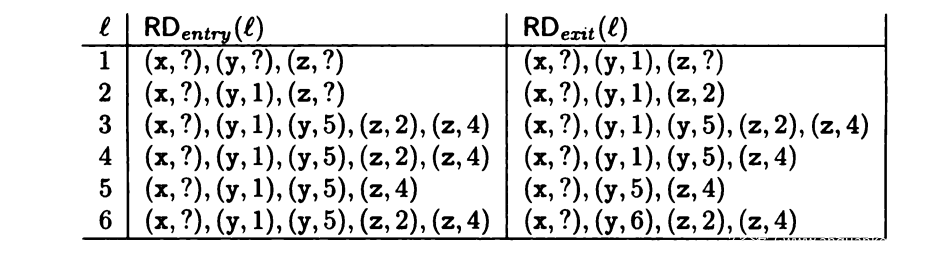 我们可以看到表格最上方一行 l RDentry(l) RDexit(l) 分别表示为我们给予语句的标签,进入该语句时所有的数据信息,退出该语句时所有的数据信息。左侧一列为标签,表格中一系列形如 (x,4) 的表达式的原型可以写作 (v,l) ,即 一个变量,和该变量的赋值语句的标签。我们可以看到最初标签都是 ? 即该变量的赋值语句并没有在我们描述的这一段代码中。同时,我们可以看到同一行中会出现多个同一个变量的表达式(如表格内第三行(z,2) (z,4))这是由于本文上面提到的代码分析的共性中的为了保持可计算性只提供近似解。我们可以看到Table1 中关于z的赋值语句有两条,分别是2和4 这也正对应表格内的(z,2) (z,4)。我们无法判断运行过程中是否会执行4语句,所以我们将2和4 都包含在可能的表中。