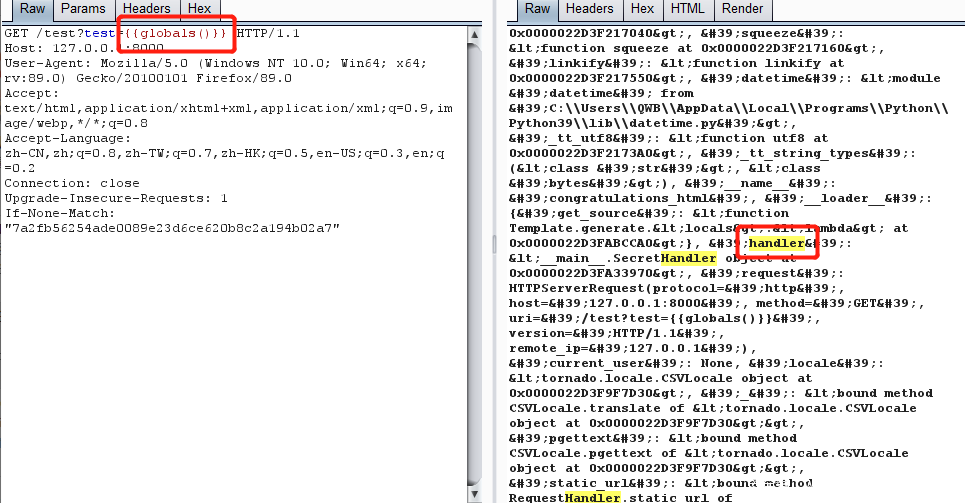 那这就很危险了,毕竟各位师傅的Python命令执行黑魔法一大堆,通过黑名单进行字符过滤是阻挡不了被命令执行的。除了python中的内置函数可以被调用外,还有一些tornado自带的原生类也可以被用来命令执行,可以使用{{globals()}}来查看所有可用的全局变量,如下图所示。