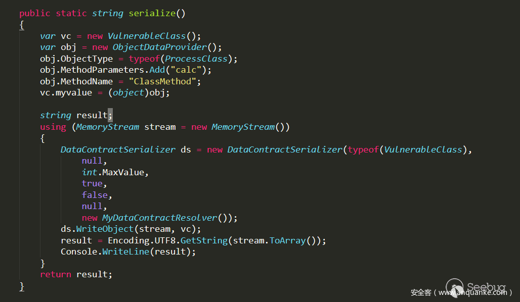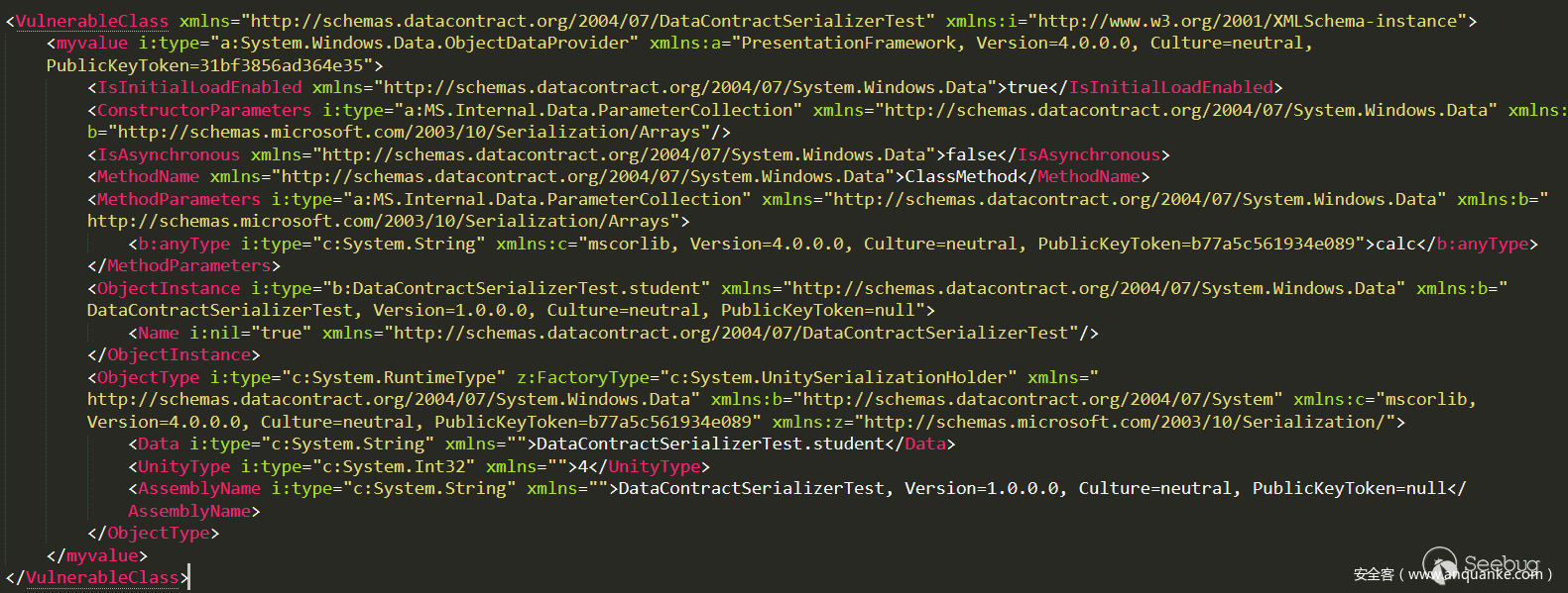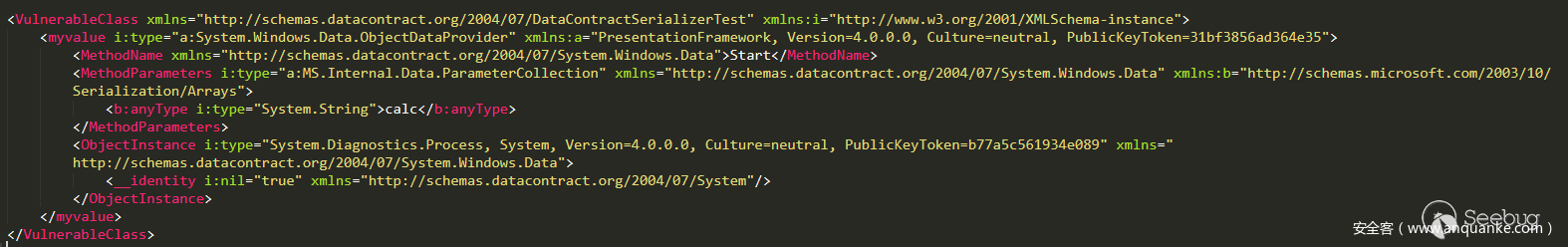 在上面的代码中,我们以VulnerableClass 为目标类型进行序列化,并且将object类型的myvalue 字段赋值为了 ObjectDataProvider() 类实例,并且通过ObjectDataProvider 调用 ProcessClass 的 ClassMethod 方法。