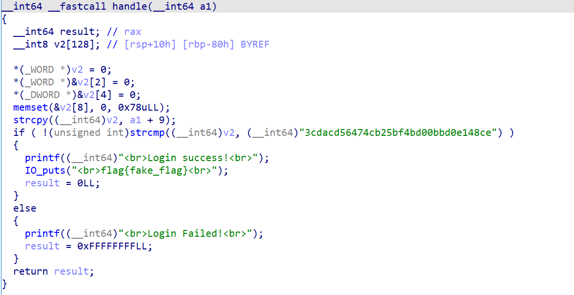 在这个函数中先把栈上的数据清 0,再把参数从第 9 位开始复制到栈上,从九位开始的原因是为了从 password=wjh 中取出 wjh 这个字符串用于判断,因为这个才是 Web 中真正输入的密码信息。