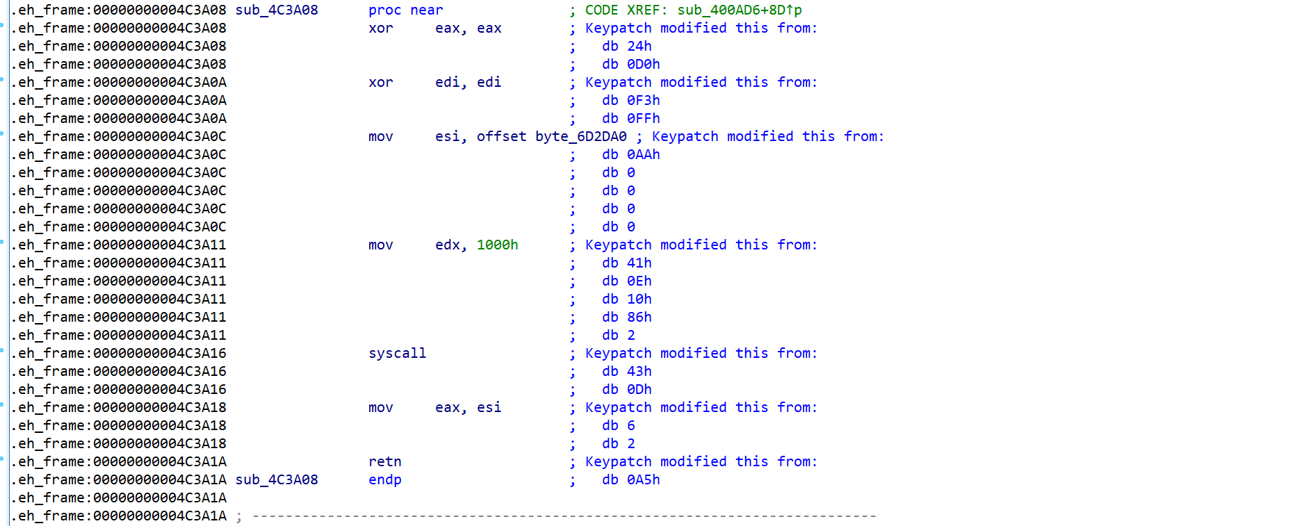 程序中的 .eh_frame 这段空间是有执行权限的,如果直接 patch 程序的字节不够实现我们想要的功能,那么我们只需要直接在这段空间上写汇编代码,并且使想要 patch 的地方 call 这个地址即可,并且在修改之后返回到原来的位置。
