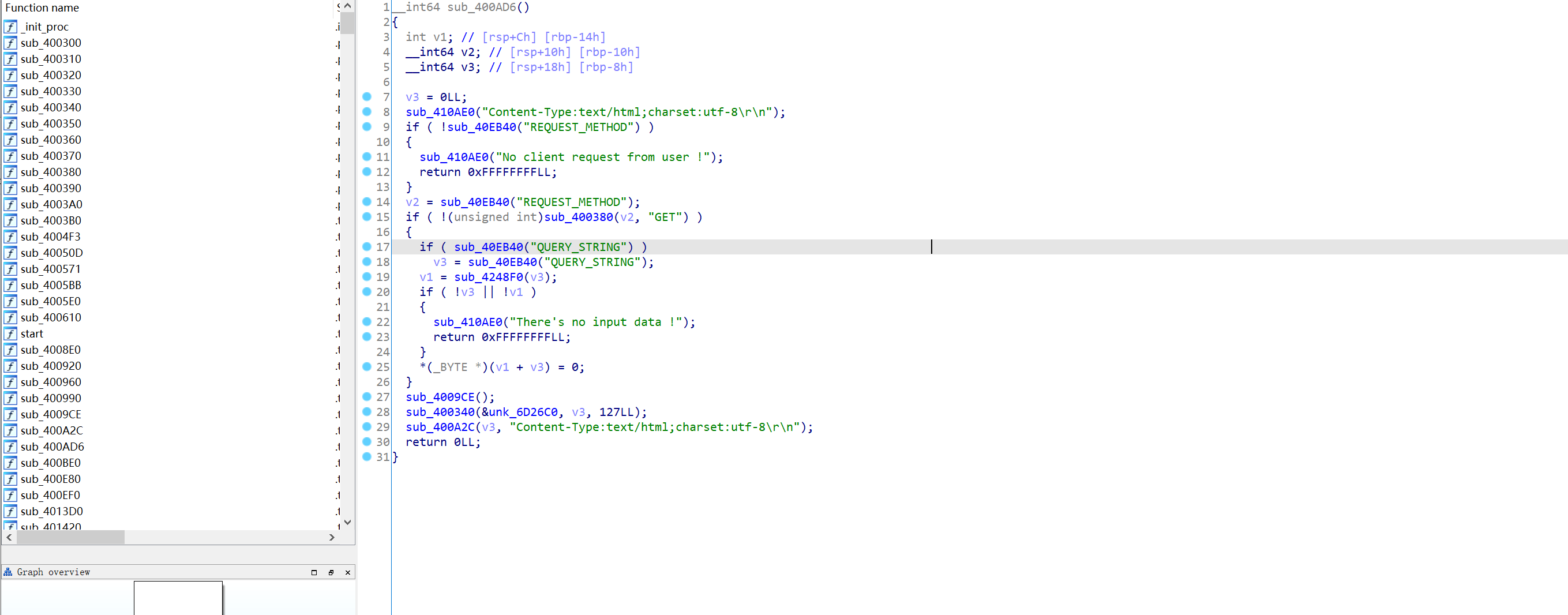 我这里使用的方法是直接 nop 掉 GET 参数的那部分判断,然后 patch getenv(“QUERY_STRING”)为 read 函数,具体的汇编代码如下。