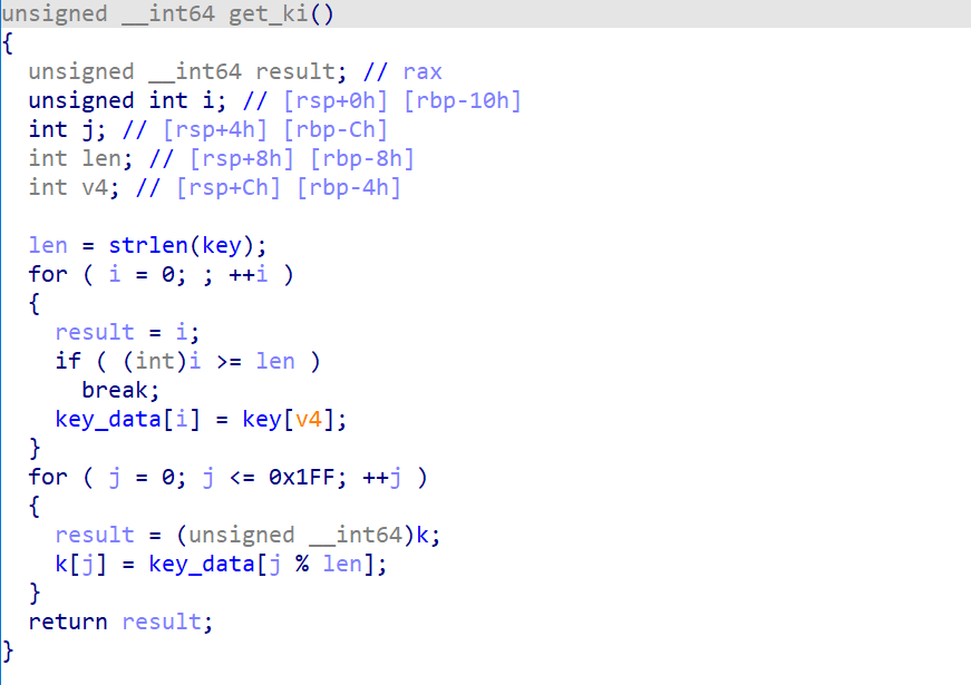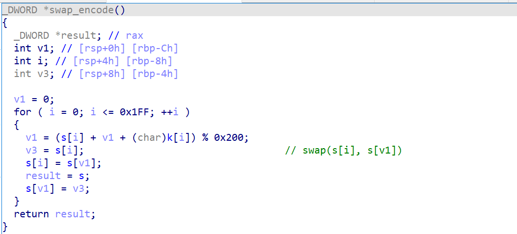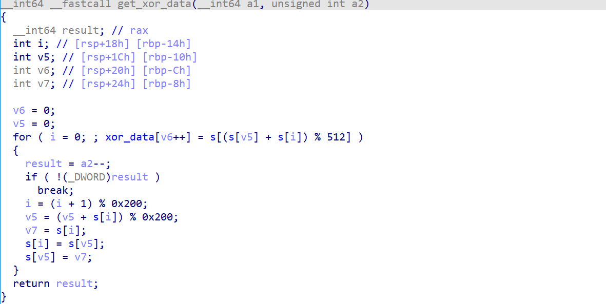 其实看到这几个函数,就可以大概猜到程序的加密是使用的魔改的 RC4 加密(把 RC4 加密中的 0x100 改为了 0x200)。