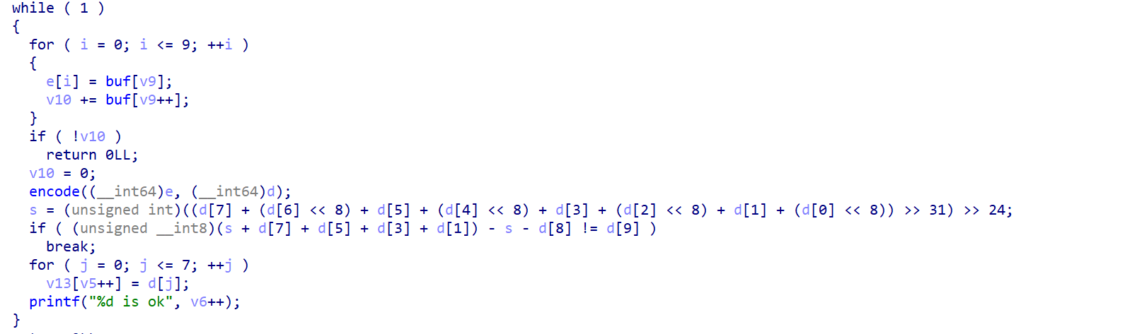 因为异或的数据是固定的,所以实际上这里传入的数据如果全都是\x00,就可以直接得到异或的秘钥,我觉得这里的实现是存在一定的问题的,这使得对代码的分析实际并不必要,只需要提取出异或的内容即可。
