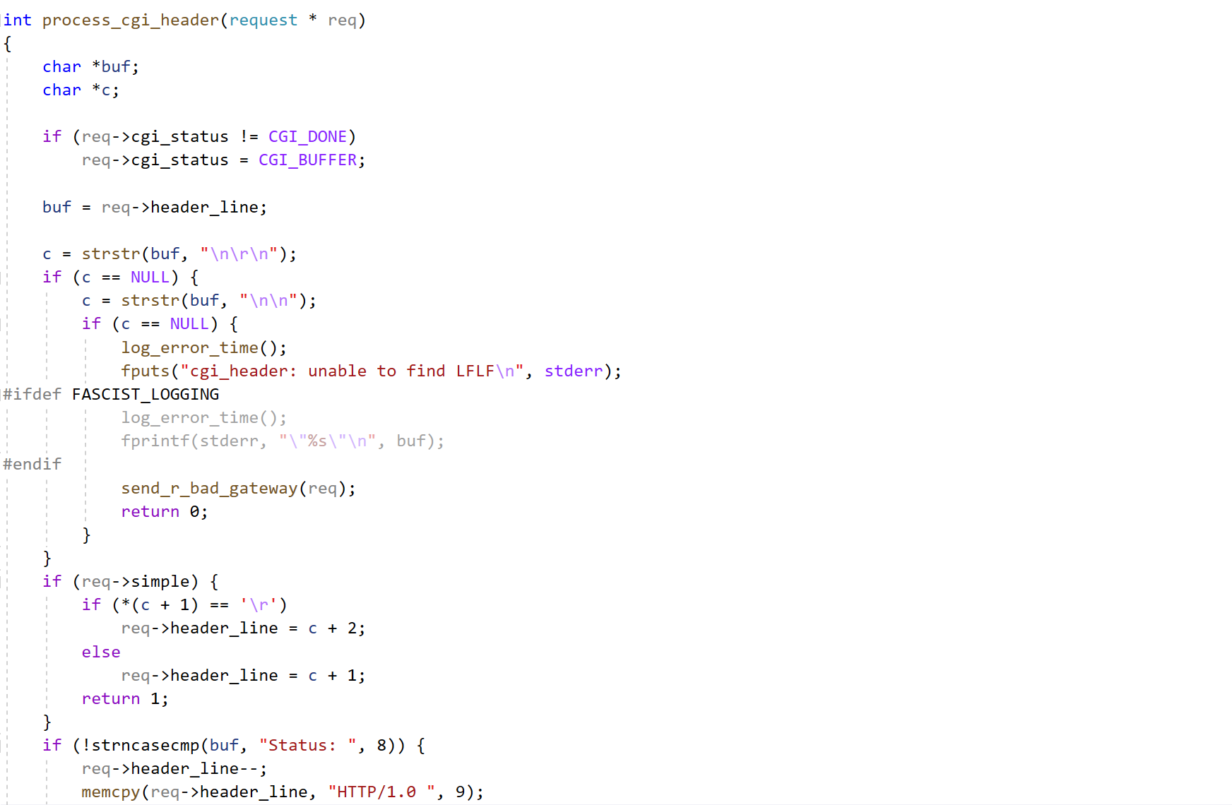这一段是 BOA 的源码,我发现当他判断 cgi 文件中没有\n\r\n 或者\n\n 这样的字符串的时候,就会报错 502。