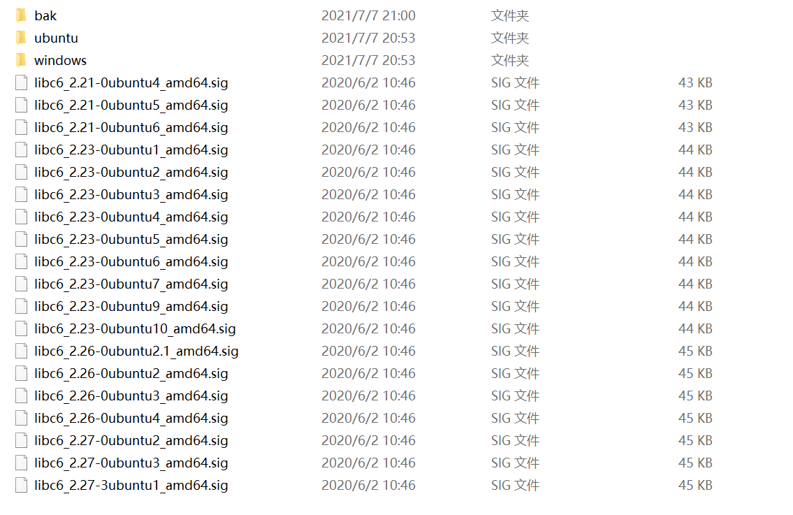 而标准库的 sig 文件也有现成制作好的,在 https://github.com/push0ebp/sig-database 中下载,并且把文件导入到 IDA/sig/pc 中就能够使用,我这里为了快速找到我们导入的 sig 文件,将该文件夹中原有的文件都放到了 bak 目录下,把我们猜测可能会用到的符号文件放置到目录下
