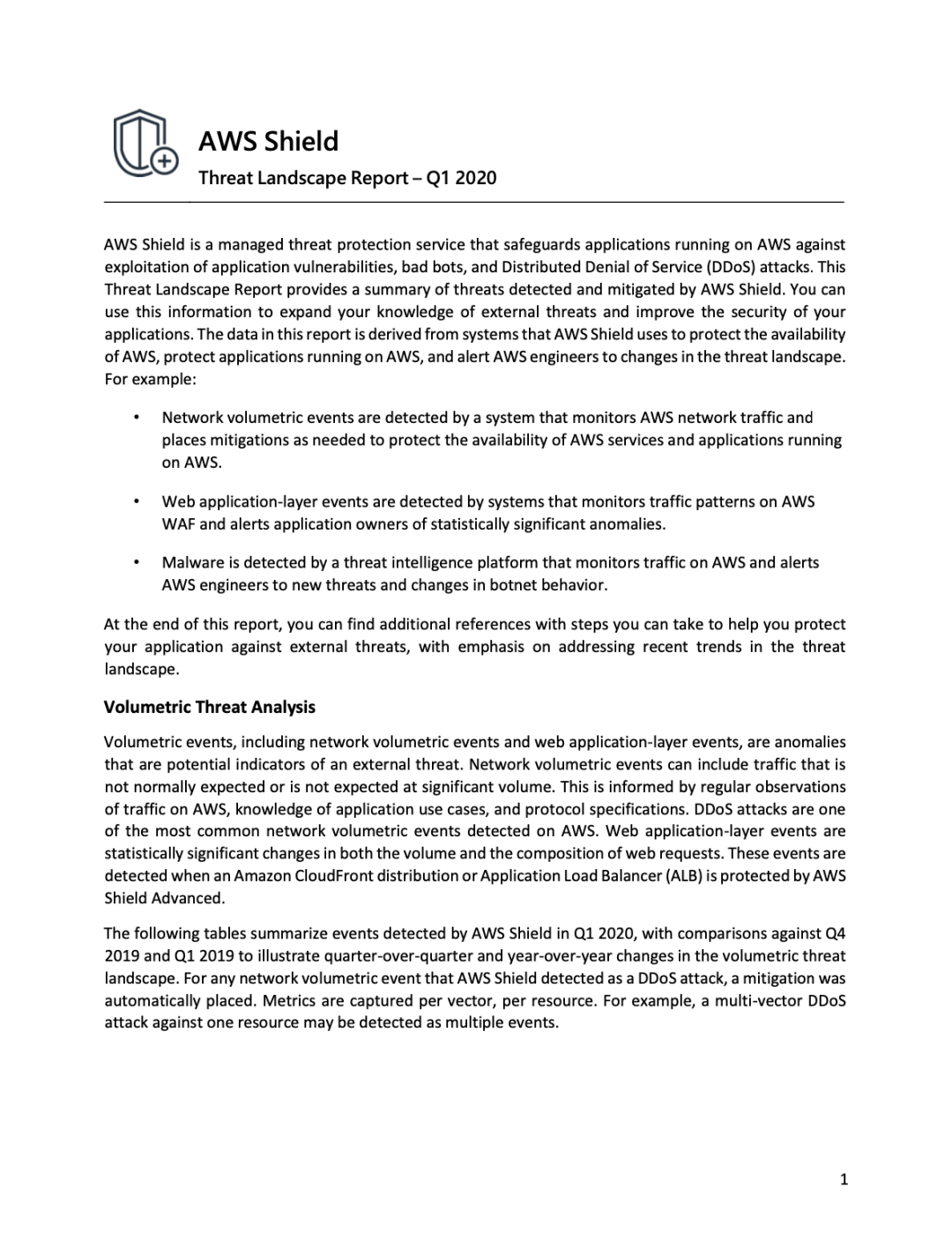AWS还见到了大规模的Docker、Hadoop、Redis和SSH攻击。AWS表示,今年2月份它遭到了创纪录的2.3 Tbps DDoS攻击,有人持续三天攻击云服务,企图使其瘫痪,所幸并未得逞。身份不明的攻击者每秒向AWS的服务器发送2.3万亿字节的数据,数量之大委实惊人。为了让读者对此有具体的了解,其攻击规模比2018年导致GitHub宕机的1.3 Tbps攻击大近一倍,比2016年导致Dyn瘫痪的大约1 Tbps的Mirai僵尸网络DDoS大一倍多。AWS在本周发布的第一季度AWS Shield威胁态势报告中表示,针对AWS的攻击是基于CLDAP反射的攻击,其规模比这家云提供商之前看到的任何攻击都要大44%。AWS并没有提及明显的动机,但特别指出攻击者发现了新的攻击途径后攻击活动明显加剧。反射攻击通过使用受欺骗的IP地址向第三方服务器发送请求来滥用合法协议。响应的流量要大得多,返回到浑然不知的受害者的受欺骗IP地址。(安全公司Akamai在2017年发现,78071台主机以逾1500字节的数据响应了最初只有52字节的查询)。CLDAP反射攻击滥用了轻量级目录访问协议(LDAP)的无连接版本。AWS的威胁报告显示,AWS经受住了这种攻击。而在此之前,这家公共云巨头看到其他服务因其DNS服务在2019年10月遭到DDoS攻击而宕机。报告还着重介绍了第一季度用于企图攻击在AWS上运行的服务的四种最突出的(恶意)“交互类型”。在该季度攻击者共尝试了4100万次,企图使用这四种攻击手法来破坏服务——占所有事件的31%。AWS没有命名明确的通用漏洞披露(CVE)编号,只是提到: