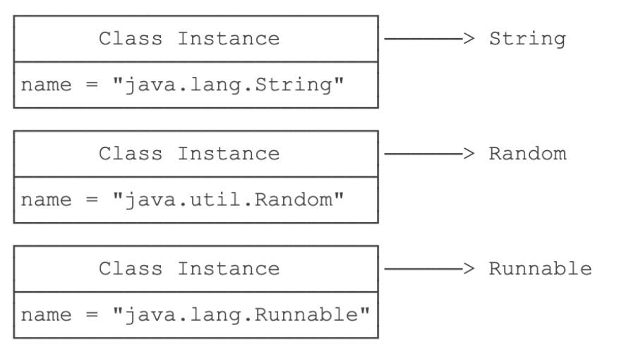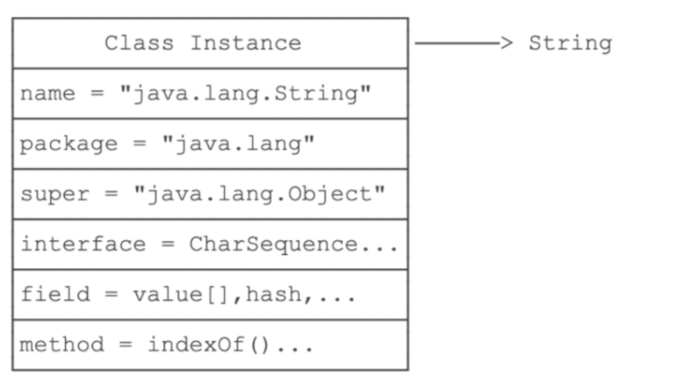 我之前画了一个类与Class对应关系图我这里搬过来讲一讲,下图是String类和Class对象的对应关系,可以看出每个类对应的Class Instance中保存着这个类的相关信息。String类不是实例,它是一个class,只是可以用一个Class的实例来描述。