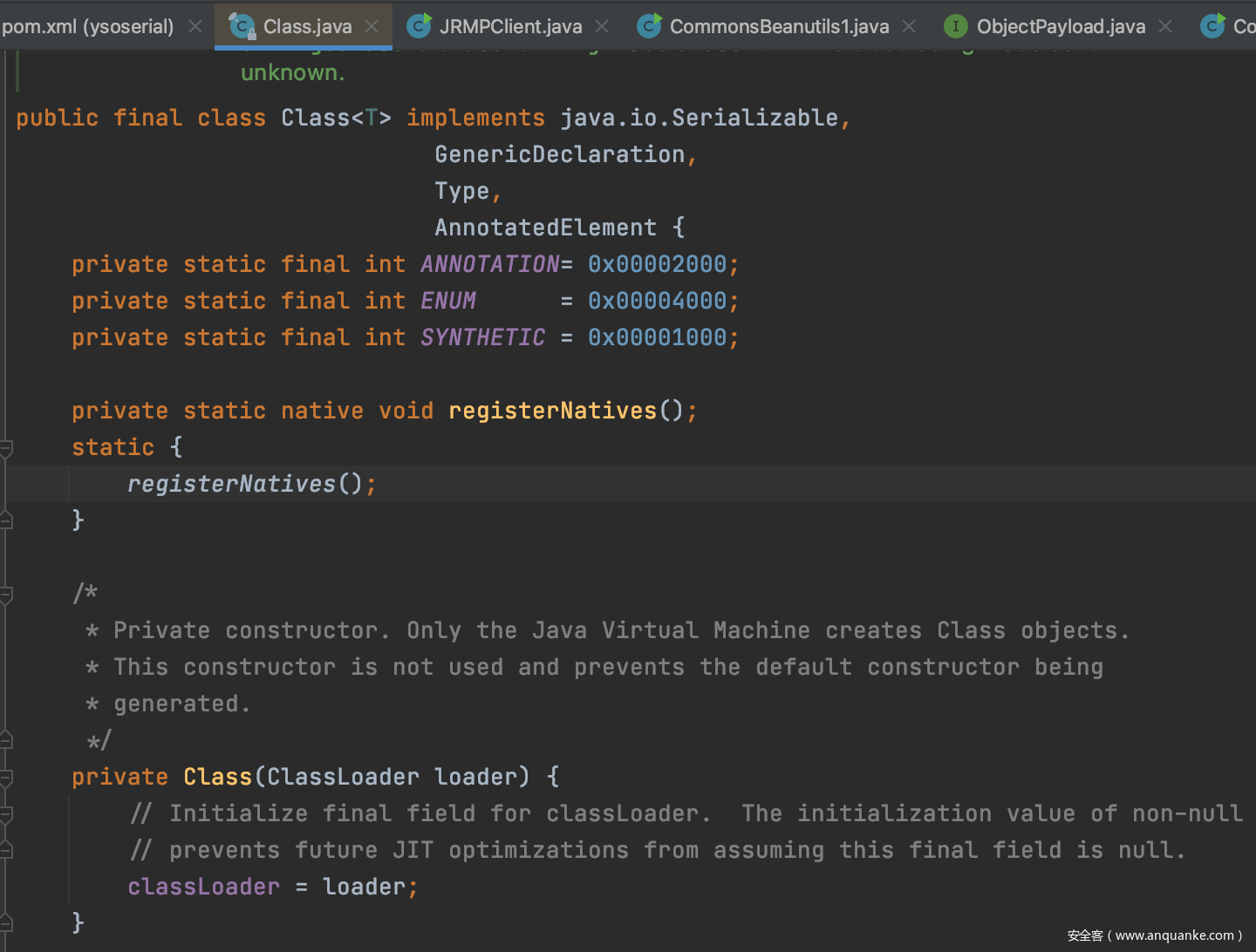 Class主要用于反射,正是因为该类实例保存了对应类中的方法和属性信息,我们的反射调用才能正常进行(我感觉在学反射前先把这块给理清楚),一般反射时进行的操作是获取要反射类的Class对象,从而获取类型元数据(metadata),比如字段、属性、构造器、方法等,获取后并调用。