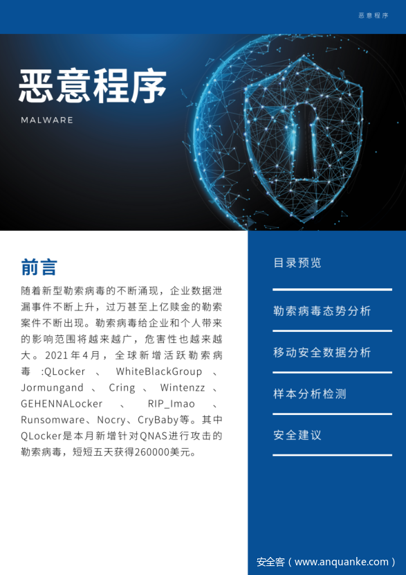 2021年4月,全球新增活跃勒索病毒:QLocker、WhiteBlackGroup、Jormungand、Cring、Wintenzz、GEHENNALocker、RIP_Imao、Runsomware、Nocry、CryBaby等。其中QLocker是本月新增针对QNAS进行攻击的勒索病毒,短短五天获得260000美元。