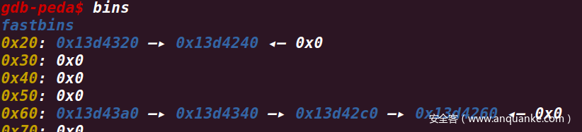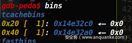 于是我们可以先分配8个空间,然后全部free掉,这样就会将tcache中0x80大小的空间填充满,且fastbins中还有一个chunk。