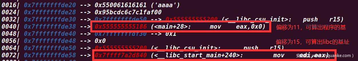 我们可以对第0块chunk进行溢出,修改chunk1的size位,修改后的size位要能够覆盖chunk1和chunk2,因此可以修改为0xb1,然后free掉chunk1,此时这一大块chunk就会放入unsortbin中,再申请一块大小为0x10的chunk,bin中就剩下了chunk2这块chunk,但是实际上这块chunk没有被free掉,但是此时他的fd指针已经指向了unsortbin的bins头,直接输出就能够泄露出libc的基址了。