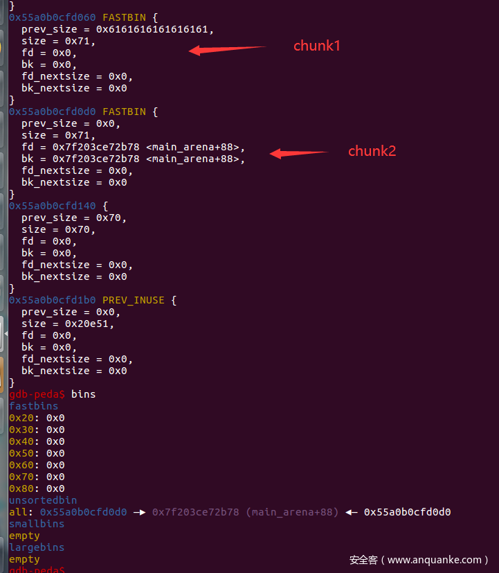 0x7ffff7dd1b78 <main_arena+88>: 0x00005555557570c0