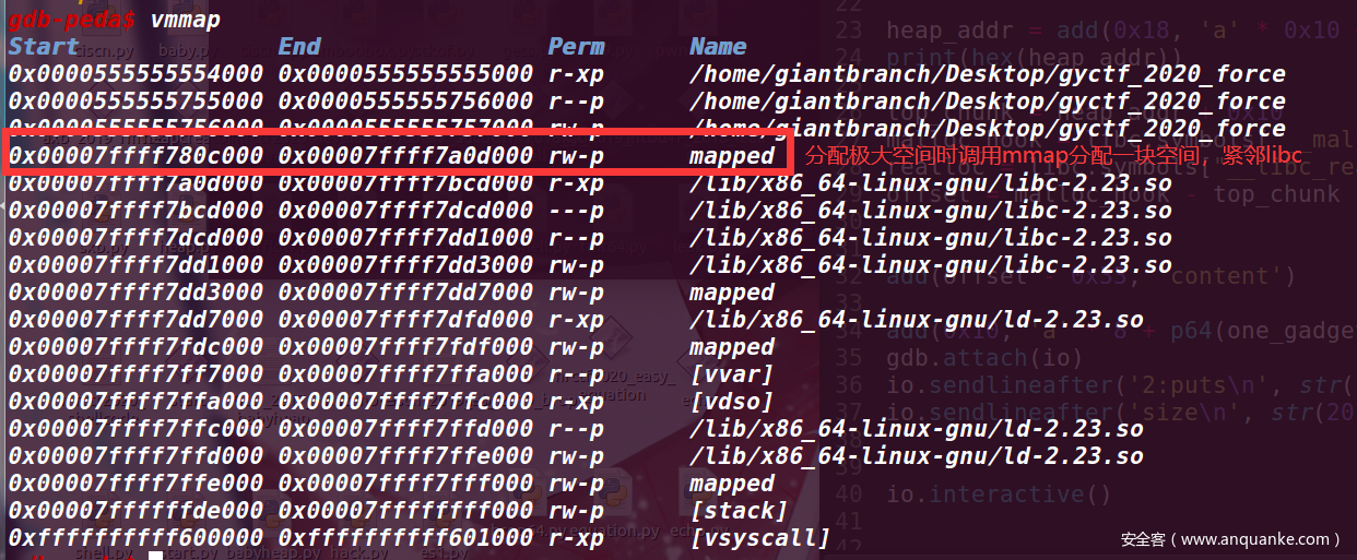在gdb中查看一下这个地址,发现与main_arena偏移为88,在之上可以找到__malloc_hook 的地址,借此泄露出libc的基址。然后我们还能再这之前找到一处适合伪造chunk的地址,伪造大小为0x71的chunk,通过修改rfree掉的chunk的fd指针指向此处,然后把它申请出来,就可以对__malloc_hook 进行修改了。