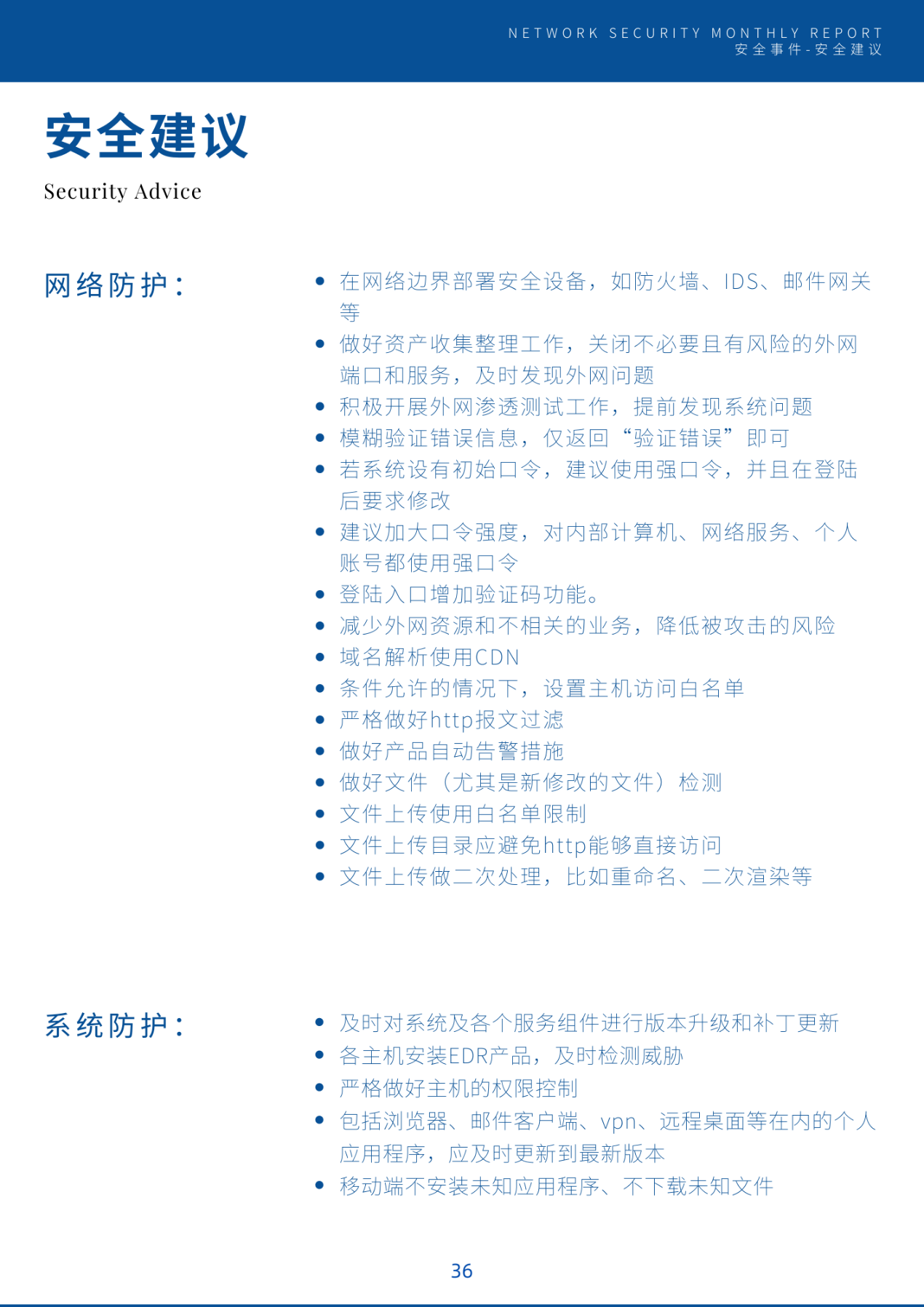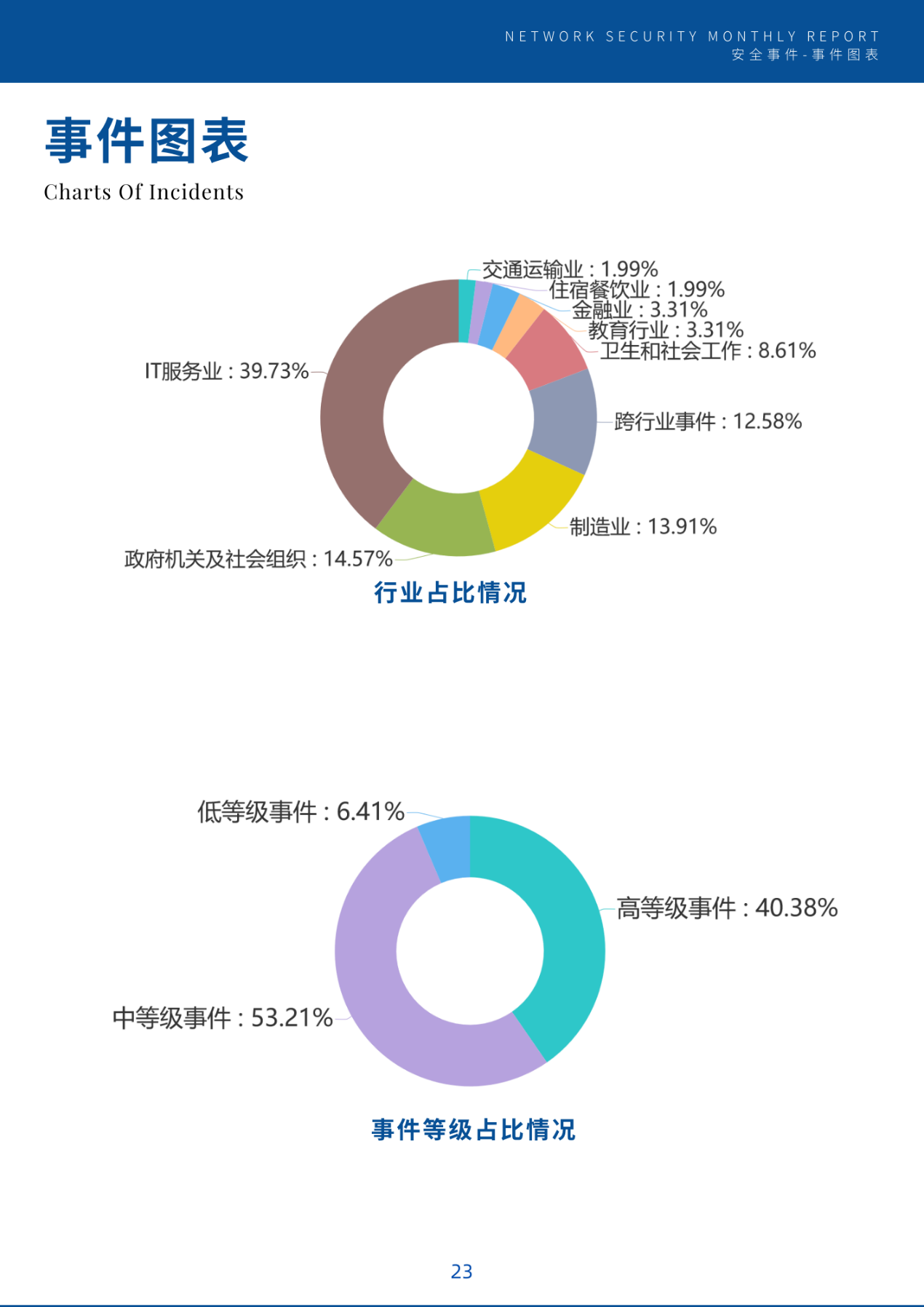 《网络安全月报》总结本月国内外安全漏洞、网络安全重大事件、恶意软件攻击态势、移动安全情况等。每个章节中都具备总结性文字、重点罗列、图表分析等展现形式,方便读者了解本月网络安全态势。
