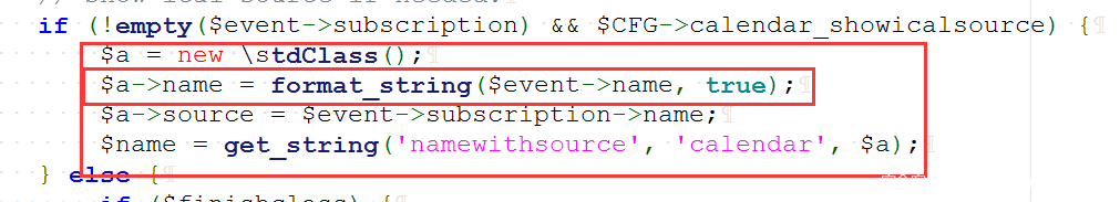 先跟进一下format_string方法,在/lib/weblib.php 1409行,此部分代码有点多就不贴出了,但是可以发现这里也是没有对$event-name变量进行过滤的。