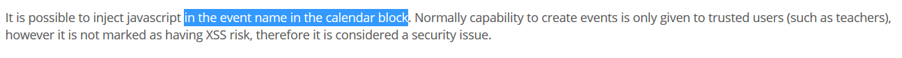 “可以在日历块中的事件名称中注入JavaScript。但通常情况下,创建活动的能力只提供给信任的用户(如教师),所以不会被标记为具有XSS风险,而被视为安全问题。”