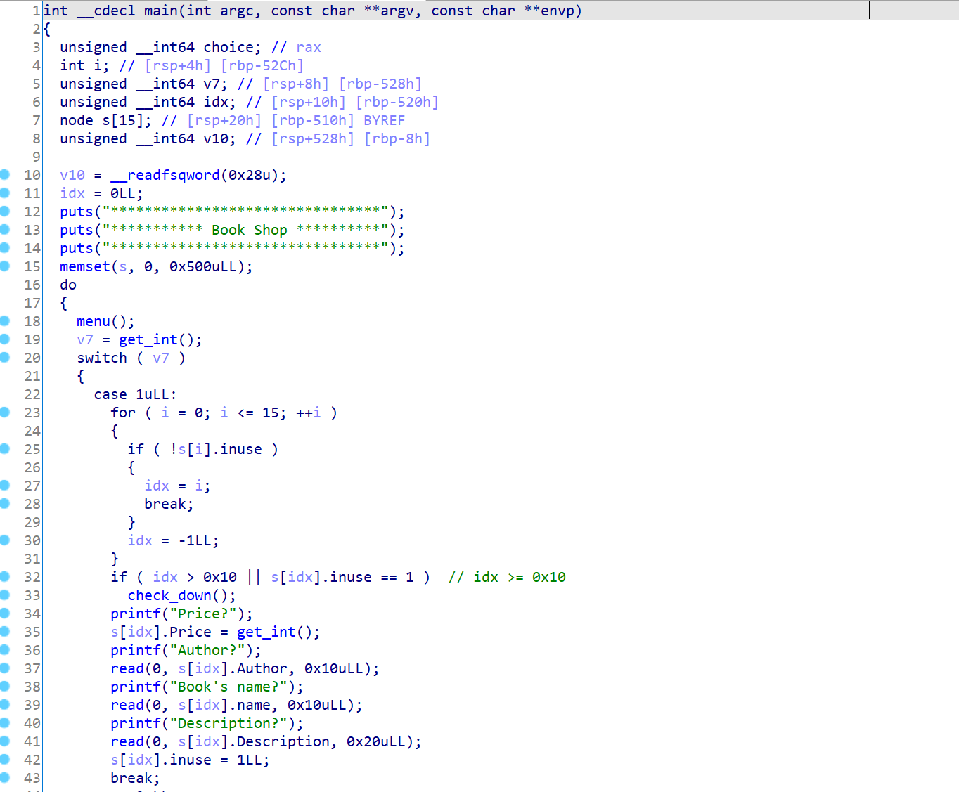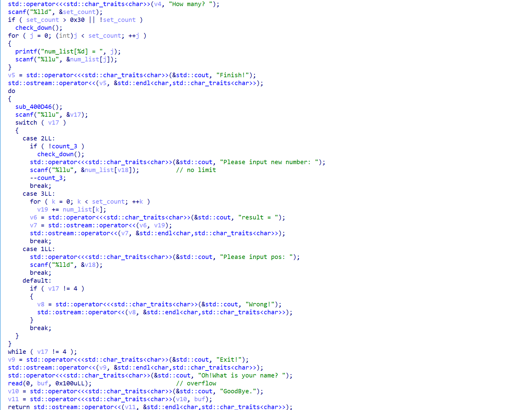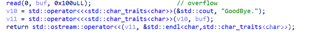 在修复完结构体的数据后,可以很快速的发现这里存在一个溢出,问题就在于判定范围的时候没有考虑到临界情况,从而导致了溢出0x50个字节。