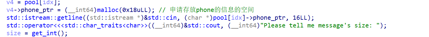 调试后发现,实际上这里存放phone的0x21空间,很适合用于伪造成0x91,并且这部分内容和我们之后用calloc申请的message_ptr相接,那部分的内容大小正好是0x71,这样的话也可以绕过glibc prev检测(0x20 + 0x70 = 0x90)。