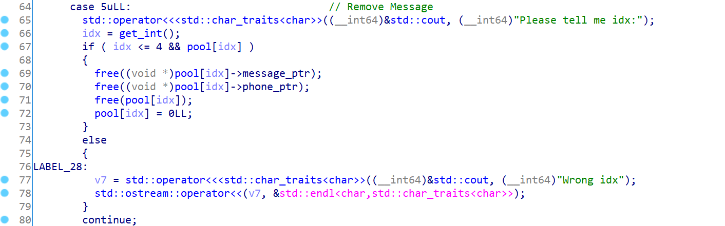 我们可以发现这里在free之后,只对了pool[idx]进行置0,而没有对pool[idx]->message_ptr和pool[idx]->phone_ptr进行置0。而观察其他代码可以发现,程序对于某个index所指向的Message结构体是否有效的判定依赖于对pool[idx]是否为0的判定,如果为0则意味着这个Message结构体未被使用或被释放,由此我们可以想到,是否有一处地方可以把释放掉的Message结构体重新申请回来,使得pool[idx] != 0,而且此时这个结构体上有pool[idx]->message_ptr和pool[idx]->phone_ptr这两个残留指针,如果这两个残留指针没有被覆盖,我们就可以构成UAF或者double free。