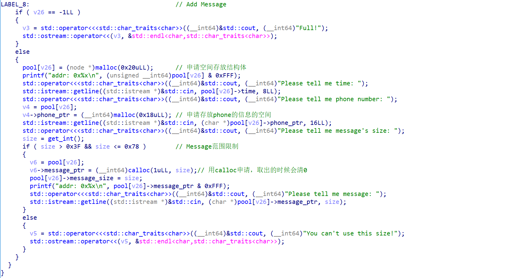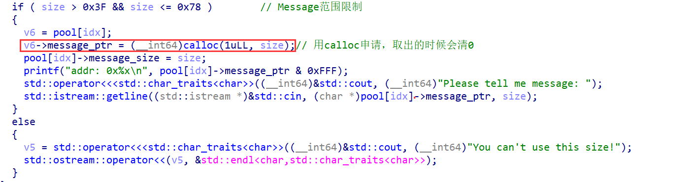 所以我把找漏洞的重心都放在了Add Message这里,发现了这里代码中存在问题,问题在于对Message size检验不通过后,没有做对这块错误堆块结构的后续处理(free、置0等等),而是直接进入了下一次菜单逻辑,而且在这个过程中message_ptr的残留指针没有被覆盖。