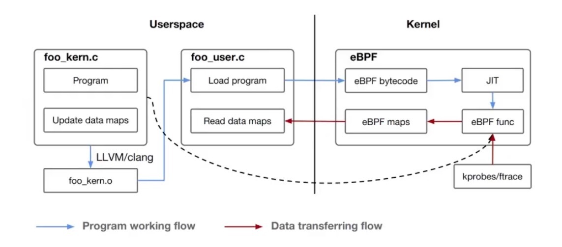 用户空间程序负责加载 BPF 字节码至内核,如需要也会负责读取内核回传的统计信息或者事件详情;