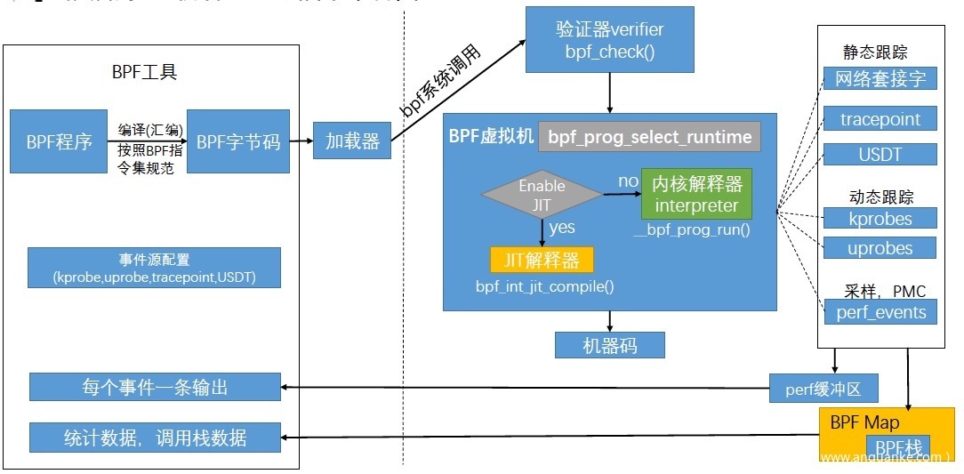 内核中的 BPF 字节码负责在内核中执行特定事件,如需要也会将执行的结果通过 maps 或者 perf-event 事件发送至用户空间;