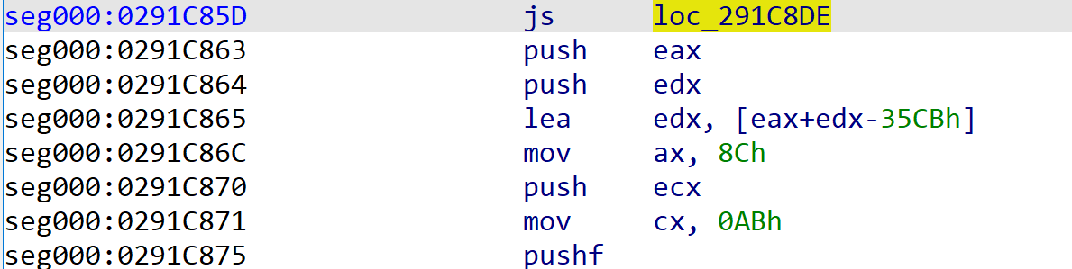 以上图为例,这个时候需要把0x291C85D处的js改成jmp,并且将0x291C863-0x291C8D5之间的指令标记为垃圾指令。