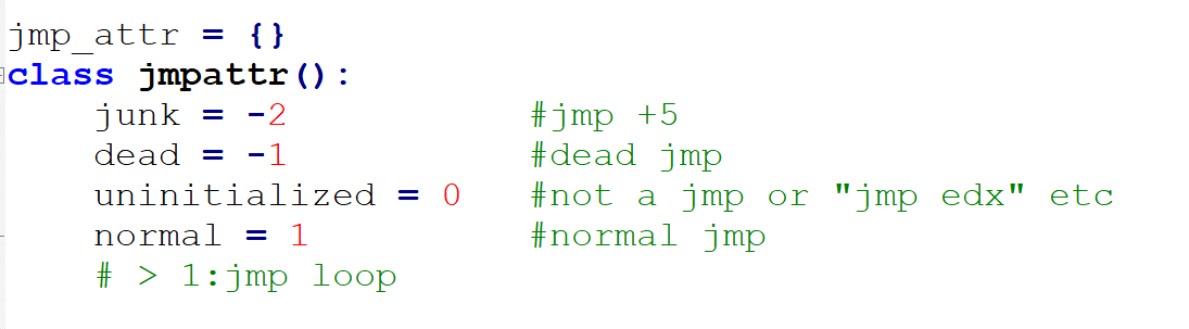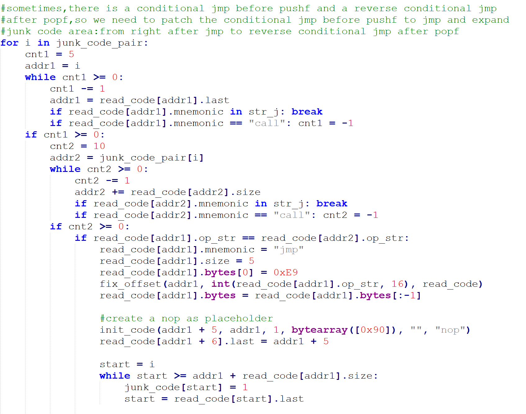有pushfd+垃圾指令+popfd这样的,也有pushfd+垃圾指令+popfd+垃圾指令+popfd或者pushfd+垃圾指令+pushfd+垃圾指令+popfd等等情况。还有pushfd之前和popfd之后可能也会有少量的垃圾指令,在expand_pushfd_popfd函数中把这些垃圾指令也尽量都考虑进去。最后将结果保存在名为junk_code_pair的dict中。dict的key是垃圾指令的起始地址,valve是垃圾指令的结束地址。用名为junk_code的dict对垃圾指令进行标记,dict的key是指令的地址,valve为1表示该指令是垃圾指令。