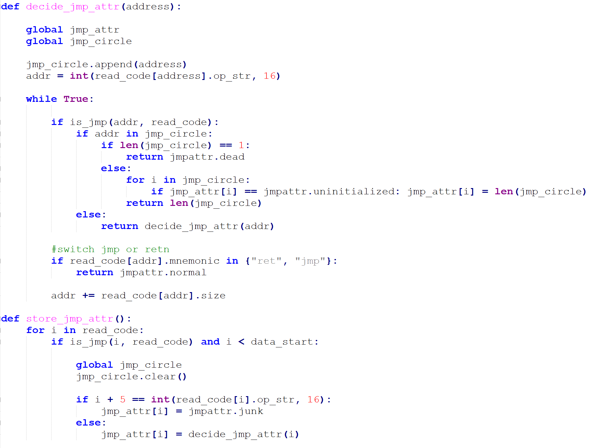 接下来需要恢复程序的控制流,程序的控制流被打乱是因为插入了很多jmp导致IDA Pro反编译F5效果不好。先标记所有的jmp。一共有四种jmp,第一种是jmp +5这样无意义的jmp(值为-2),第二种可能是死循环的jmp(值为-1或者大于1),第三种是jmp一个寄存器(值为0),第四种是正常的jmp(值为1)。对于死循环的情况,比如说0x1000处的指令是jmp 0x2000,0x2000处的指令是jmp 0x1000,那么这两个jmp的标记都是2;再比如说0x3000处的指令是jmp 0x3000,那么这个jmp的标记就是-1。做标记的目的是为了防止处理时陷入到死循环里面。