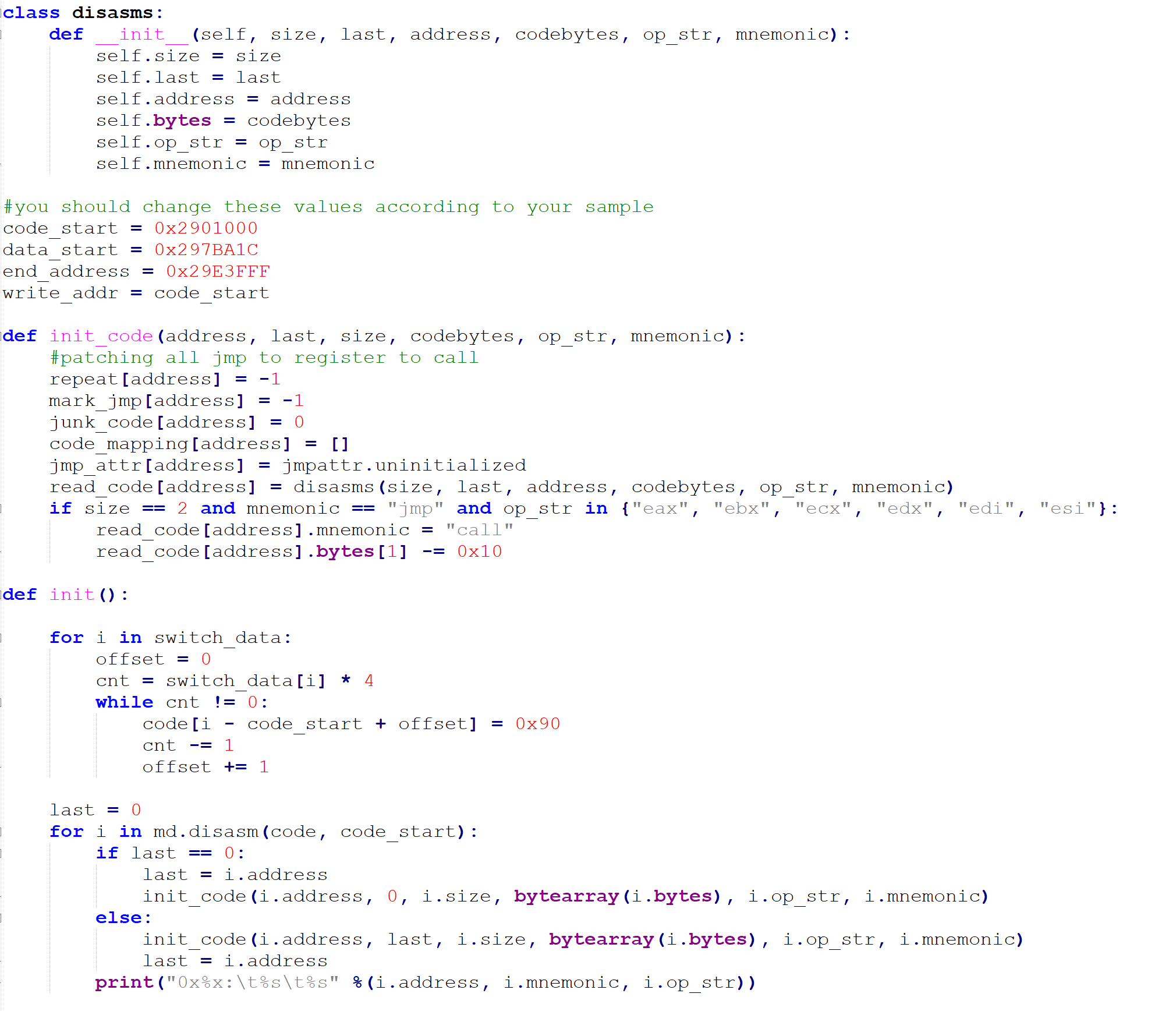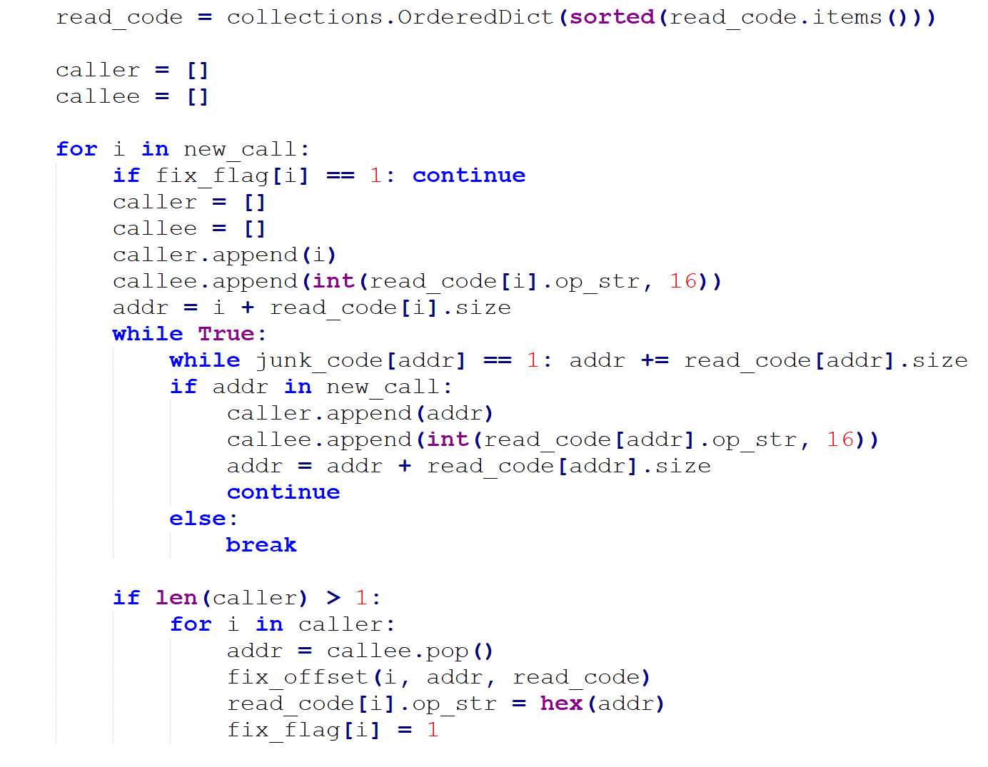 在process_read_code函数中调用deal_jmp函数恢复了控制流,跳过了垃圾代码,整理好的代码放在了和read_code类似的名为write_code的dict中。这个过程中得到一个名为code_mapping的dict,key是read_code中指令的地址,valve是该指令被写到write_code中的地址的列表。接下来调用process_write_code函数根据code_mapping修正write_code中指令。