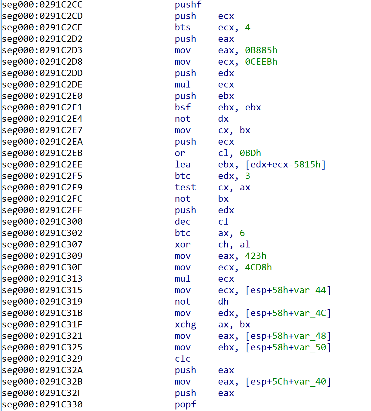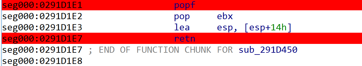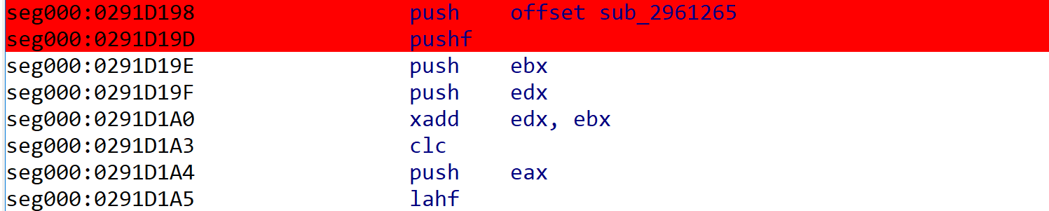 2.有时pushf之前有一条push 0xAAAAAAAA或者mov dword ptr [esp], 0xAAAAAAAA这样的指令,popf之后是一个retn: