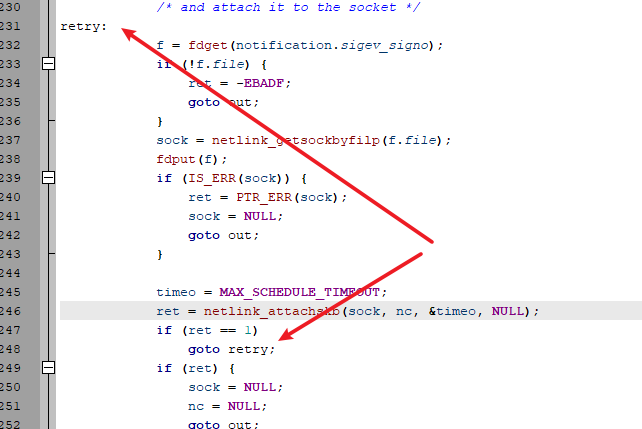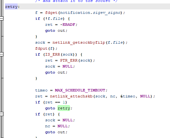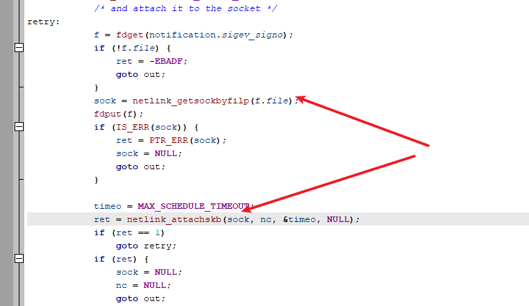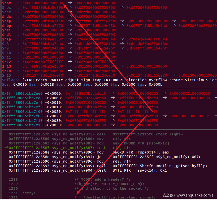 Posix消息队列允许异步事件通知,当往一个空队列放置一个消息时,Posix消息队列允许产生一个信号或启动一个线程。这种异步事件通知调用mq_notify函数实现,mq_notify为指定队列建立或删除异步通知。由于mq_notify函数在进入retry流程时没有将sock指针设置为NULL,可能导致UAF漏洞。