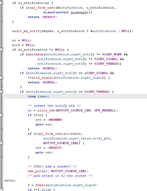 根据上面的补丁信息,先查看函数的执行流程,下图是经过删减的mq_notify函数。