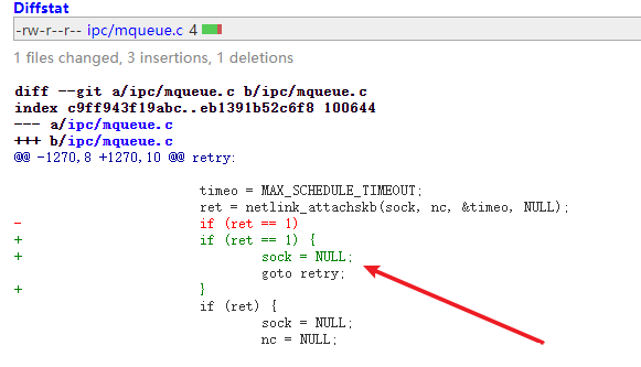 可以发现补丁点在mqueue.c,并且只添加了一行。