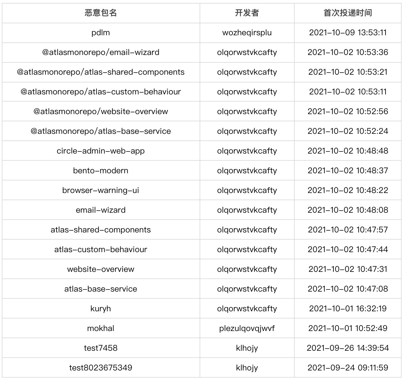 根据阿里云供应链安全监测系统对历史恶意投毒攻击的分析显示,该攻击团伙早在今年9月就开始对Npm实施投毒攻击,投递的恶意包具有相同的攻击手法,由此推断,此次投毒事件是一次精心规划后的攻击行为!