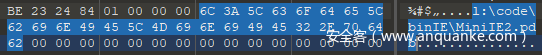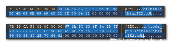 经过简单的关联分析之后,很快可以得到结论,该家族的样本binIE\MiniIE2.pdb 的信息不会变,前面的盘符和code_路径有可能改变,但若只匹配binIE\MiniIE2.pdb 还是有一定几率的误报,所以可以以该段hex数据作为过滤条件,加上部分的实际代码抑制误报。