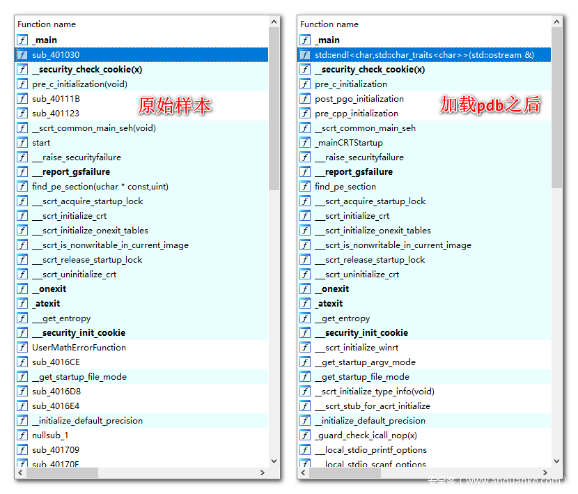 还是以上面的简单代码为例,在加载pdb之后,可以最大程度的还原符号表,提升分析效率