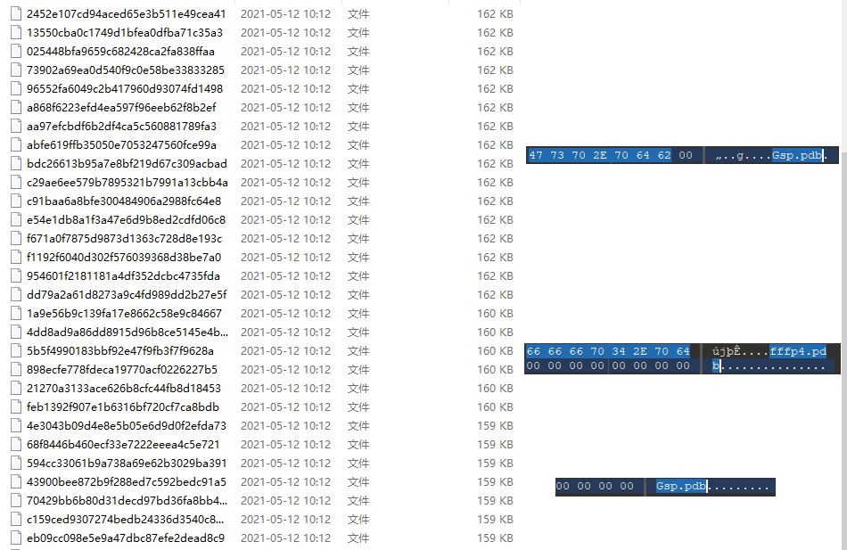 样本下载回来之后,按照大小排序,可以看到一共有三类样本,分别是162kb大小、160kb大小和159kb大小。三类样本对应的pdb信息分别是 Gsp.pdb、fffp4.pdb、Gsp.pdb