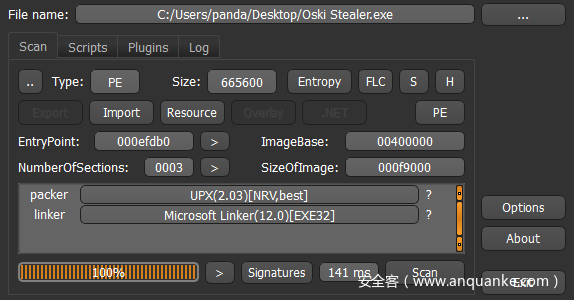 笔者捕获到一例OskiStealer最新的病毒样本,该样本使用UPX加壳处理,如下所示: