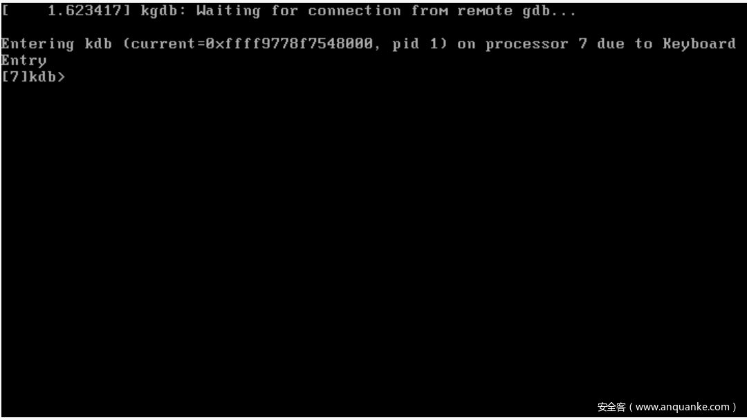 当Server端开机后选择新编译的内核后进入如下图的状态后,说明目前内核处于挂起状态,在等待kgdb连接。