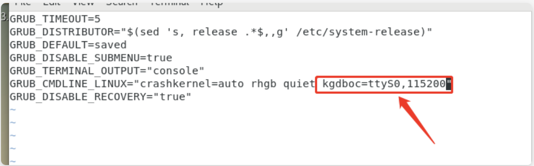 vim /etc/default/grub GRUB_CMDLINE_LINUX 中增加 "kgdboc=ttyS0,115200" grub2-mkconfig -o /boot/grub2/grub.cfg