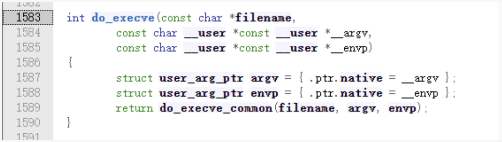 通过sys_call_table获取到的sys_execve最终是通过do_execve来完成其功能,在sys_execve这一层面主要做了要执行文件的文件信息校验,确认要执行的文件无误后传入do_execve中。