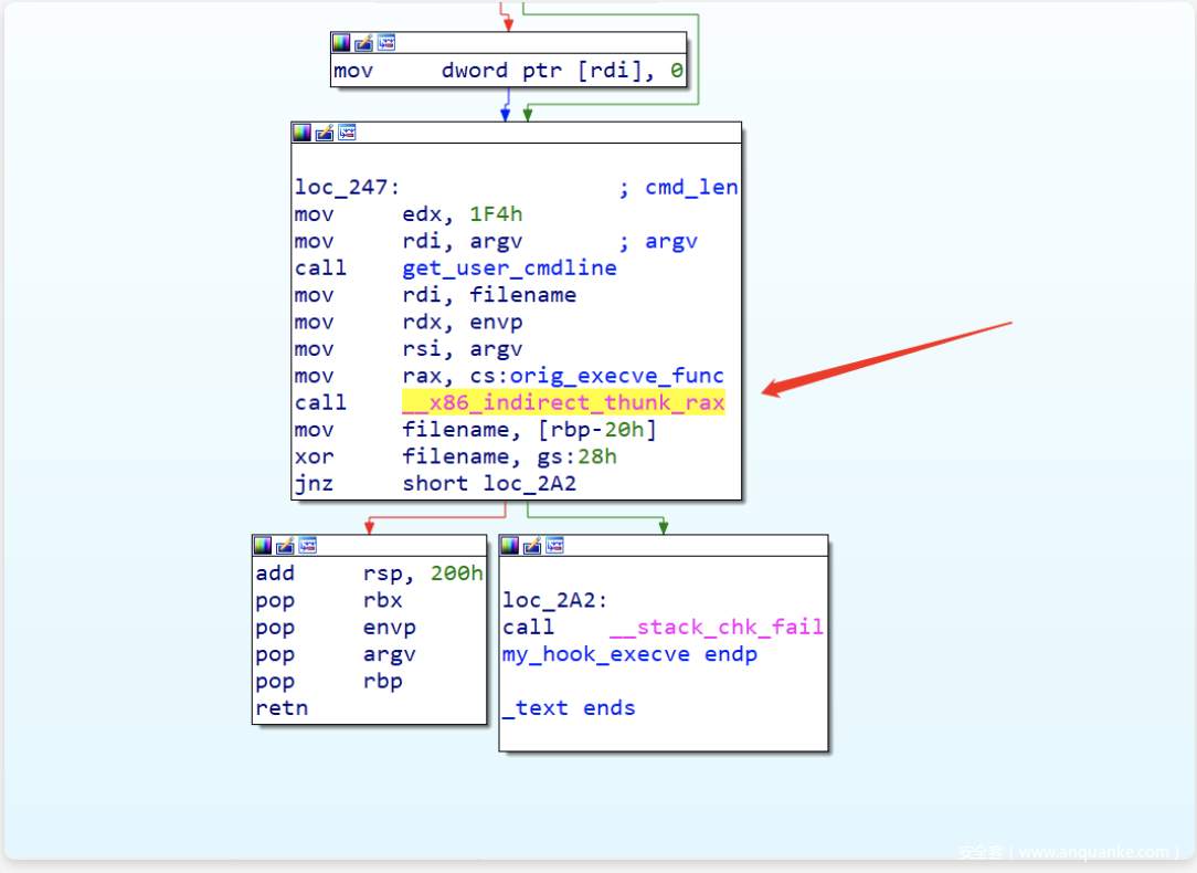 代码逻辑里最终调用原本的sys_execve函数是通过一个动态调用实现的,编译完成后就变成了__x86_indirect_thunk_rax 这个符号,总不能把这玩意删了吧?