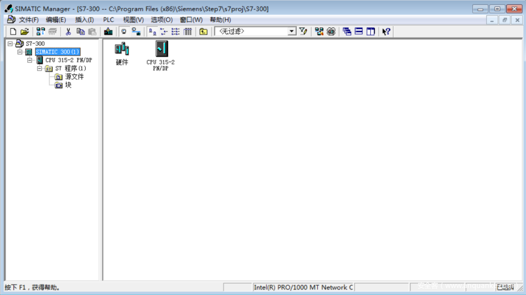 首先建立一个项目,在项目中插入一个SIMATIC300站(CPU315-2DP/PN)。