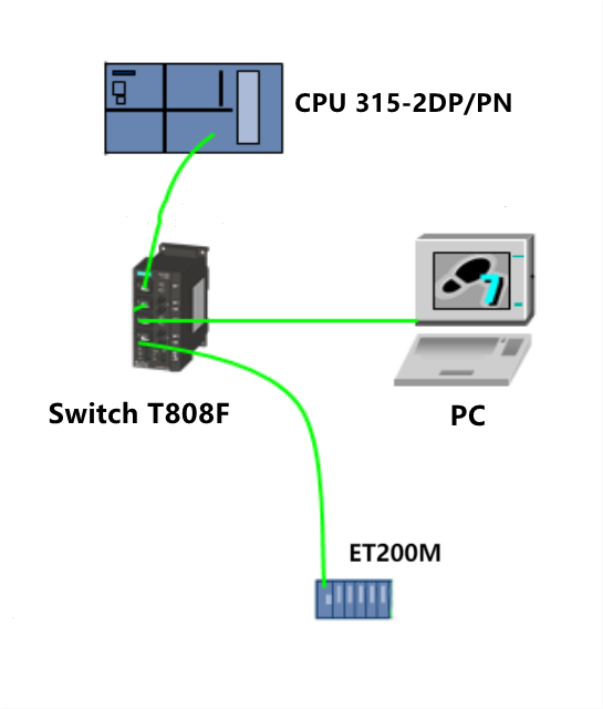 PROFINET主站(PLC):过程数据交互、配置、逻辑 控制、报警,可以完成控制自动化任务。主站采用西门子公司S7-300型PLC以及I/O模块,PLC模块配有集成的PROFINET接口,采用网线和交换机构建成数据交换网络,能够使用STEP7在工业以太网上通过PC进行编程。