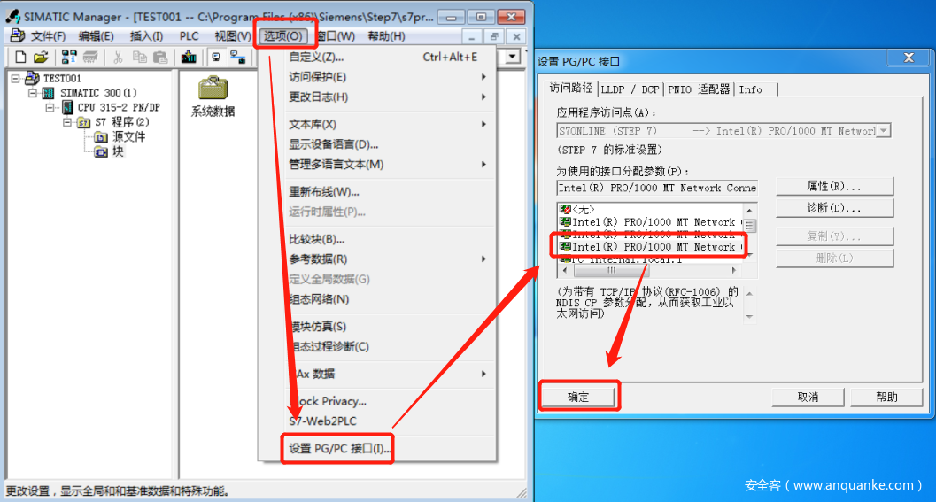 对于PROFINET的组态下载和调试,使用TCP/IP协议,所以在SIMATIC Manager中选择“选项”菜单,选择“设置 PG/PC接口…”。选择“TCP/IP->Intel(R) PRO/1000MT…”接口参数。其中“Intel(R) PRO/1000MT…”表示本台PG/PC的以太网卡。