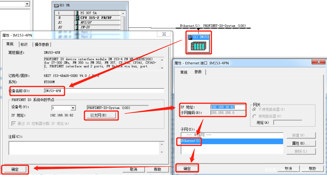 在这个子网Ethernet(1)中,配置一个IO设备站,配置IO设备站与配置PROFIBUS从站类似。同样在右侧的栏内找到需要组态的PROFINET IO的ET200M的标识,并且找到与相应的硬件相同的订货号的ET200M接口模块。然后使用鼠标把该接口模块的图标托拽到Ethernet(1)上,并在属性窗口设置IP地址和连接的网络,以及设置相应的参数。